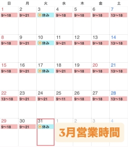 お知らせ 3月営業時間
